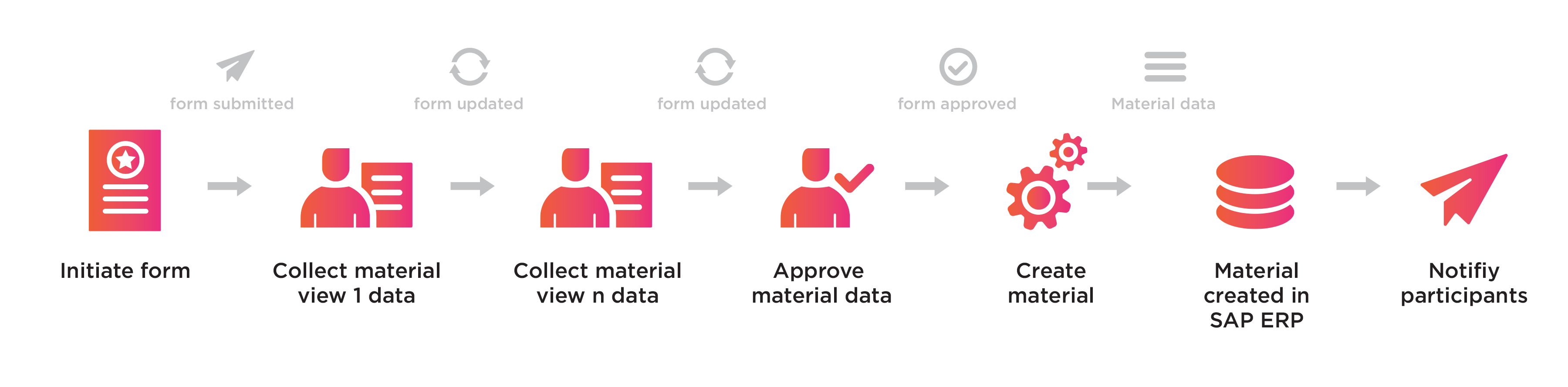 You can define different routings to map different material creation/extension process variants. Using the process routing composition tool, you can orchestrate a series of action types (user, system, notification) to automate the material data management process.